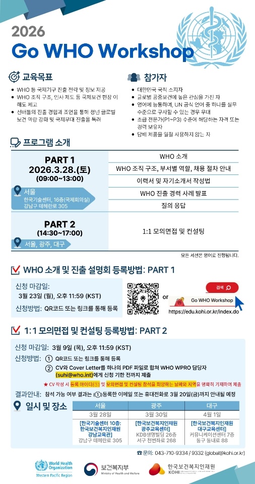 보건복지부와 한국보건복지인재원, WHO가 공동 주관하는 ‘2026 Go WHO Workshop’ 개최 소식을 안내드립니다. 국제보건 분야 및 국제기구 진출을 꿈꾸는 학생들의 많은 관심과 참여 바랍니다.