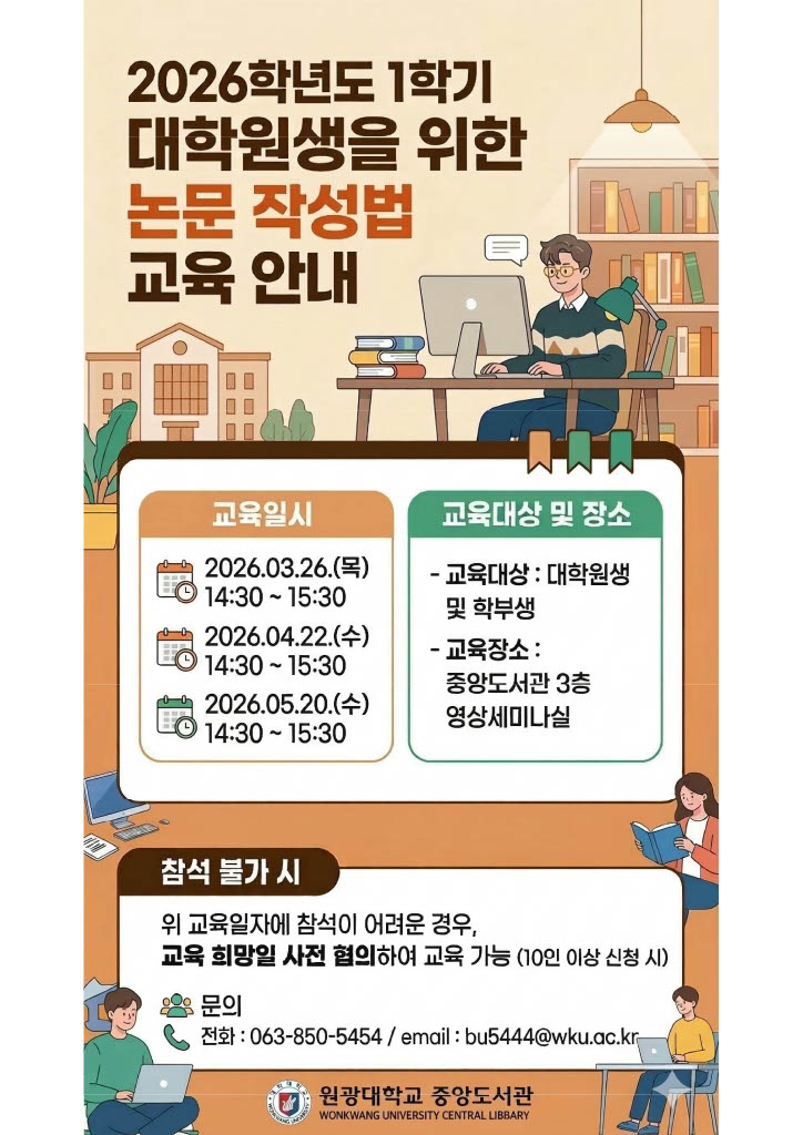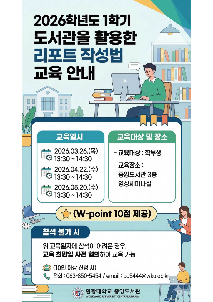 중앙도서관에서 학부생의 과제 수행과 대학원생의 연구를 돕기 위해 리포트 및 논문 작성법 교육을 실시합니다.